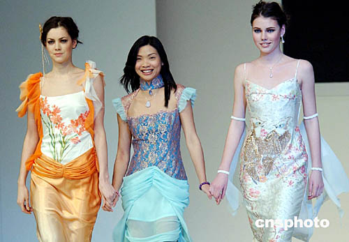 1月21日,在“香港時裝節秋冬系列”及“香港國際時尚薈萃”上,舉辦第二場“國際時裝設計師表演”,展示來自香港、澳洲、印度尼西亞10位才華橫溢的時裝設計師作品。圖為香港時裝設計師Simone Ng與模特登臺謝幕。作者:洪少葵