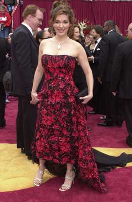 身著阿瑪尼時裝的勞拉·哈林(Laura Harring)出席在第74屆奧斯卡頒獎禮上。當時她展示一對價值上百萬美元的白金鉆石孔錐形高跟鞋。這雙鞋子由設計師斯圖亞特·威特門和白金協(xié)會共同完成。哈林還戴了一條價值兩千七百萬元的項鏈。