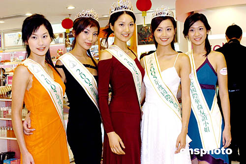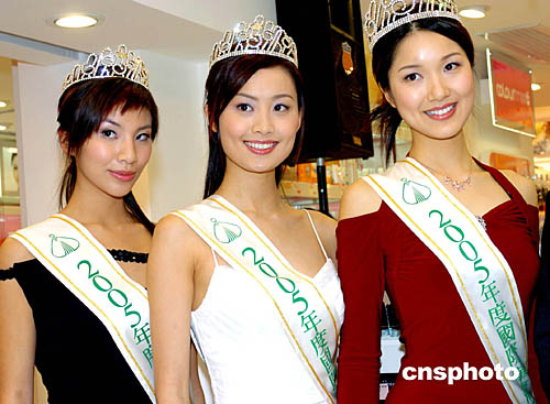 2005年香港度國際華裔小姐競選冠軍李亞男、亞軍陳法拉、季軍楊文琪,日前在頒獎儀式上亮相,并為香港一家化妝品店營銷造勢。中新社記者:宋吉河