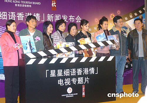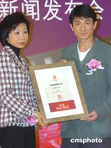 展示香港旅游特色的電視專題片《星星細語香港情》2月1日在香港開鏡﹐在新聞發布會上﹐香港旅游發展局總干事臧明華(左)向在劇中擔任主角的劉德華致送委任狀。