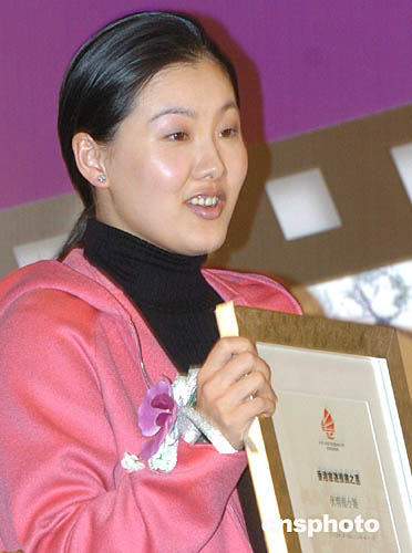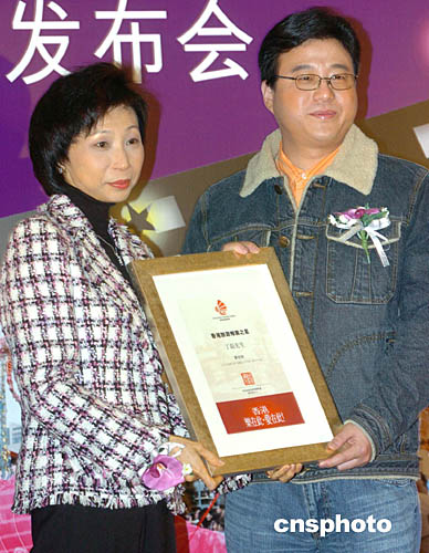 展示香港旅游特色的電視專題片《星星細語香港情》2月1日在香港開鏡﹐在新聞發布會上﹐香港旅游發展局總干事臧明華向在劇中擔任主角的“網絡精英”丁磊(右)致送委任狀。