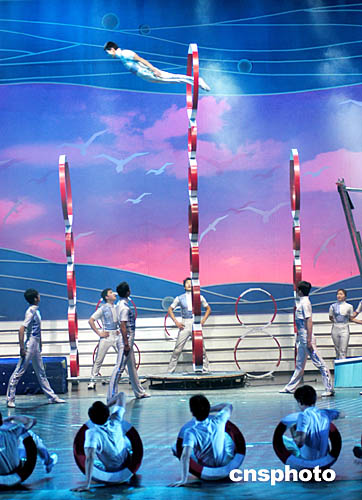 春節(jié)來臨,解放軍沈陽軍區(qū)雜技團(tuán)的演員在2005年軍民迎新春文藝晚會(huì)表演雜技《踏浪飛歌》時(shí),以極度高難的翻騰技巧,準(zhǔn)確地穿越用十個(gè)軍用救生圈直立羅列的高達(dá)九米的鉆圈技巧,展示解放軍勇敢的精神風(fēng)貌。中新社記者:王麗南