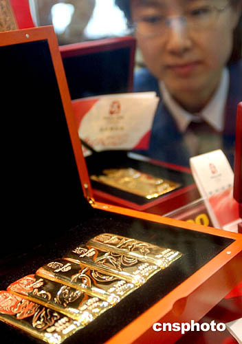 奧運歷史上首次發行的這批奧運金條,由北京奧組委授權,中國印鈔造幣總公司和中國金幣總公司聯合發行,在全國僅限量發行2008公斤。菜百業務部李經理告訴記者,鑒于北京銷售火爆,菜百將在首批首罄后向中國金幣總公司申請引進第二批奧運金條。(記者 楊開然)