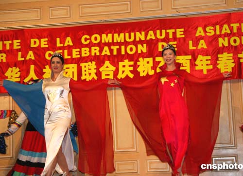 中國傳統(tǒng)春節(jié)大年初一,法國巴黎十三區(qū)政府會議大廳舉行團(tuán)拜會,演員身穿中法兩國國旗在臺上表演,有如中法國旗飄揚(yáng)在舞臺。作者:鐘誠