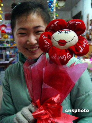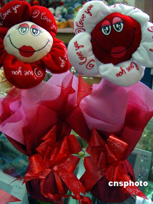 2月13日,在仙居縣一禮品商場,女青年在挑選“會(huì)說話”的“電動(dòng)玫瑰”。這種用布娃造型的玫瑰,內(nèi)安裝了馬達(dá)和發(fā)聲器,輕搖“玫瑰”會(huì)發(fā)出“我愛你”之類的聲響。“情人節(jié)”前夕,商家挖空心思、別出心裁推出“會(huì)說話”的電動(dòng)玫瑰,深受青年朋友喜愛。作者:華文武