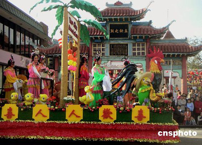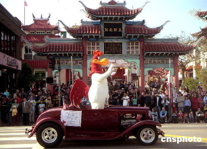 美國洛杉磯華埠二月十二日舉行第一百零六屆金龍大游行。圖一為賀歲彩車駛過唐人街,向華洋民眾祝賀中國農歷雞年新春佳節的到來。圖二為華人和各種族民眾共同歡慶中國農歷雞年。圖三為廣東潮州會館的金雞仙女彩車,為美國洛杉磯華埠二月十二日舉行的一百零六屆傳統金龍大游行錦上添花。 作者:賈國榮