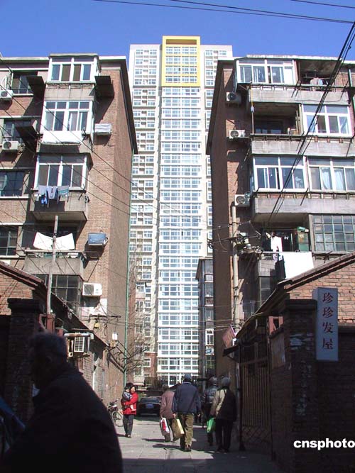 三月十八日,位于北京朝陽區雙井附近的和平村,其破舊、丑陋的紅磚平房與身后的舊居民樓和新建的商品樓形成強烈反差。和平村是北京市目前面積最大的“城中村”,當局正為改變和平村現狀進行拆遷改造。由于北京市房價高昂,對于部分拆遷戶,當地政府已與房地產公司達成協議,將向他們提供部分價格相對低廉的經濟適用房。作者:納夢月