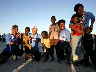 “鳳凰號” 船長翁以煊(右二),領隊鄭浩(左三)、何明禮 (右四),攝影師黃睿 (左一)與歡迎他們的肯尼亞小朋友合照。(鳳凰衛視圖)