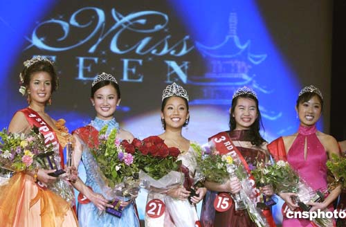 由美國舊金山華埠國際獅子會舉辦的第39屆舊金山華埠妙齡小姐競選和慈善籌款晚會,3月26日晚在加州伯靈甘市海牙大飯店舉行。圖為獲封的第一公主那佳美(左),第二公主莉薩·費,華埠妙齡小姐克萊芮薩·李,第三公主袁珊飴和第四公主凱莉·李。作者:陳鋼