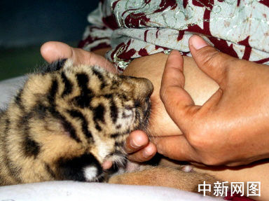 2005年4月5日,40歲的荷拉-荷泰(Hla Htay)在為仰光動物園的一只幼虎哺乳。該婦女自愿為動物園新近出生的瀕危動物--一對孟加拉幼虎喂養人乳。