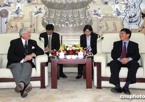 二零零五年四月六日,中國(guó)國(guó)家體育總局副局長(zhǎng)段世杰(右)在北京會(huì)見(jiàn)了加拿大奧委會(huì)首席執(zhí)行官克里斯·盧杰(左)一行,并出席中加兩國(guó)奧委會(huì)簽署的諒解備忘錄。作者:武仲林