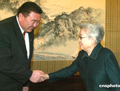 中國國務(wù)院副總理吳儀四月七日在北京會見蒙古交通運(yùn)輸旅游部長、中蒙經(jīng)貿(mào)聯(lián)委會蒙方主席巴特呼。作者:滿會喬