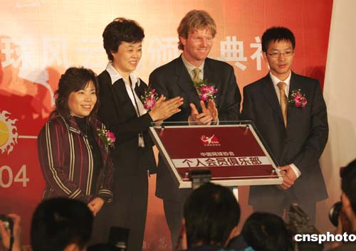 四月八日在北京舉行的“第三極中國網球峰會暨網球風云榜頒獎典禮”上,來自美國的網球“四大天王”之一考瑞爾(右二)、中國著名運動員鄧亞萍、中國網球協會副主席孫晉芳、中關村文化發展股份有限公司、第三極總裁歐陽旭(右一)等為中國網協個人會員的第一個基地揭牌。作者:武仲林