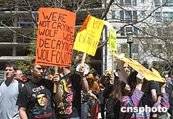 世界銀行春節會議在華盛頓舉行之際,美國示威者于美東時間4月16日中午到世行大樓外集會,抗議美國國防部副部長沃爾福威茨出任世界銀行新任行長。作者:余東暉