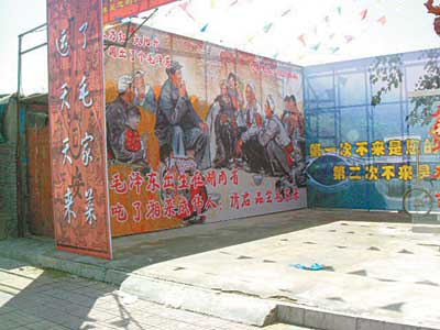 北京海淀區一家酒樓把毛主席與農民座談時的場景設計為廣告牌,懸掛在店外,并寫著“吃了湘菜成偉人”的廣告語。