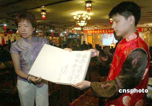 四月二十八日晚,中國國民黨主席連戰來到北京老舍茶館喝茶看戲,并為茶館題字:“振興茶文化,祥和兩岸情”。作者:廖文靜