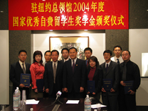 中新網(wǎng)5月8日電 據(jù)外交部網(wǎng)站消息,2005年國家優(yōu)秀自費留學生獎學金頒獎儀式7日在中國駐紐約總領館隆重舉行。劉碧偉總領事、艾方林參贊向紐約領區(qū)首屆國家優(yōu)秀自費留學生獎學金獲得者頒發(fā)了《國家優(yōu)秀自費留學生獎學金獎勵證書》及5000美元的獎學金。