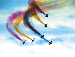 赤橙黃綠青藍紫,誰持彩練當空舞?新型表演機為在藍天織就更美的彩練,還專門加裝了拉煙控制盒。此前,拉煙系統都是經過改裝而成的。說起拉煙技術,在20世紀80年代初期,僅有美國和蘇聯少數國家具備,但它們實行技術封鎖。為了打破這種局面,表演隊經過上千次試驗,先后攻克白煙、彩煙難題,終于達到世界先進水平。