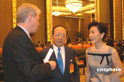 五月十七日晚,前來參加第七屆海峽兩岸經貿交易會的臺灣知名人士蔣孝嚴與夫人黃美倫在福州香格里拉大酒店與海外工商界人士親切交談。作者:福建分社
