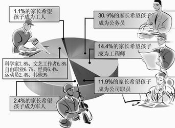 但調(diào)查同時(shí)顯示,家長(zhǎng)對(duì)孩子未來期望過高。近三分之一的父母希望自己的孩子將來能夠成為公務(wù)員,只有1.1%的家長(zhǎng)希望孩子成為工人(見圖1)。父母對(duì)孩子的希望一定程度上反映了當(dāng)今社會(huì)的一種價(jià)值取向。