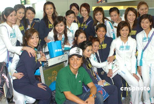 香港歌星方力申13日“率領”20位候選港姐乘坐斯里蘭卡航空公司航班奔赴馬爾代夫﹑斯里蘭卡﹑泰國拍攝外景﹐在香港機場與候選港姐合影。作者:趙振清