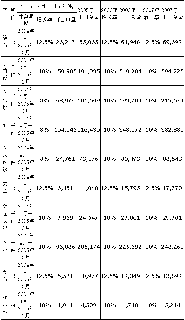 2005—2007年輸歐10類紡織品出口數量安排表