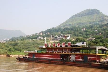 筆者一行自云陽新城的南岸驅舟,橫穿長江抵達南岸的張飛廟碼頭。船行長江,江上風清日烈。談笑間,舟已至南岸。棄舟登岸,拾階而上。路陡且窄,兩邊多仿古店肆,店家小販叫賣不斷。烈日如炙,同行者皆汗流夾背。