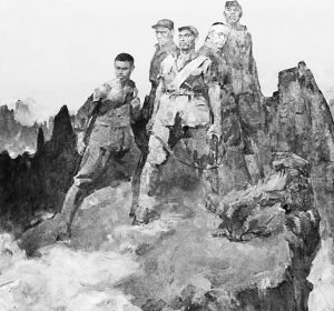 1941年8月,侵華日軍華北方面軍調(diào)集7萬余人的兵力,對晉察冀邊區(qū)所屬的北岳、平西根據(jù)地進(jìn)行毀滅性“大掃蕩”。9月25日,日偽軍約3500余人圍攻易縣城西南的狼牙山地區(qū),企圖殲滅該地區(qū)的八路軍和地方黨政機(jī)關(guān)。晉察冀軍區(qū)第1軍分區(qū)某部第7連奉命掩護(hù)黨政機(jī)關(guān)、部隊(duì)和群眾轉(zhuǎn)移。完成任務(wù)撤離時,留下第6班馬寶玉等5名戰(zhàn)士擔(dān)負(fù)后衛(wèi)阻擊,掩護(hù)全連轉(zhuǎn)移。他們堅(jiān)定沉著,利用有利地形,奮勇還擊,打退日偽軍多次進(jìn)攻,斃傷90余人。次日,為了不讓日偽軍發(fā)現(xiàn)連隊(duì)轉(zhuǎn)移方向,他們邊打邊撤,將日偽軍引向狼牙山棋盤陀峰頂絕路。日偽軍誤認(rèn)咬住了八路軍主力,遂發(fā)起猛攻。5位戰(zhàn)士臨危不懼,英勇阻擊,子彈打光后,用石塊還擊,一直堅(jiān)持戰(zhàn)斗到日落。面對步步逼近的日偽軍,他們寧死不屈,毀掉槍支,義無反顧,縱身跳下數(shù)十丈深的懸崖。馬寶玉、胡德林、胡福才壯烈殉國;葛振林、宋學(xué)義被山腰樹枝掛住,幸免于難。