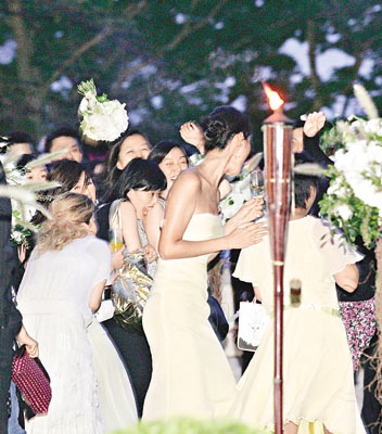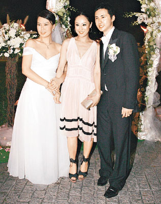 新娘子Stephanie平日為旗下藝人做慣幕后軍師,前晚輪到她當(dāng)主角,她喜孜孜地說:“婚宴請(qǐng)了二百五十人,擺了二十五桌,Gigi送手鐲、莫文蔚送耳環(huán)、蔣怡送飾物、楊采妮送的好有心思,但我不會(huì)講是什么。最開心天心都由臺(tái)灣來香港,楊采妮更陪我挑選結(jié)婚戒指,Gigi尋晚陪著我整晚,幫我想問題考新郎。拋花球時(shí)我想另外一個(gè)圈外人接到,又想天心接到,因?yàn)樗杏岩积R來。”
