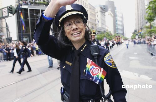 美國(guó)舊金山六月二十六日舉行第三十五屆同性戀大游行時(shí),舊金山市華裔警察局長(zhǎng)方宇文女士興致勃勃走在大街上維護(hù)秩序。作者:陳鋼