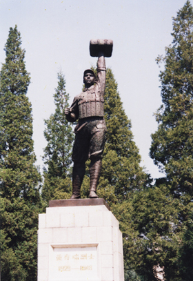 在亭、館間兩條對角線交點上,是翠柏簇擁的董存瑞烈士塑像。英雄身著軍裝,昂首挺胸,左手高擎炸藥包,右手緊握拉開的導火索,再現了董存瑞視死如歸的英雄氣概。