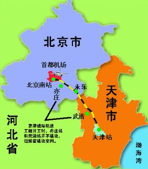 專家介紹,京津城際軌道交通工程由北京南站東端引出,沿既有京山鐵路線南側向東,過亦莊工業園區、永樂新城至天津楊村后,再沿既有京山線北側至天津站。此線建成運營后,最小行車間隔為三分鐘,北京、天津間全程直達運行時間為半個小時左右。
