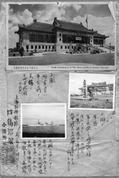 在一塊硬紙板上,這位日軍軍官特意將上海市市政府大樓被日軍轟炸前后作了比較。在被炸毀的上海市政府大樓照片中,還顯示出一塊寫有“上海神社建設(shè)地”的牌子。這幅照片的圖片說明注明當(dāng)時(shí)日軍有在上海市府前建靖國神社的企圖。在同一紙板后面,所貼的照片顯示了當(dāng)年上海火車站被炸毀的慘狀。
