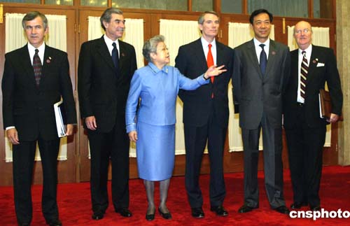 七月十一日,第十六屆中美商貿聯委全會在北京人民大會堂召開。中國國務院副總理吳儀(左三)、中國商務部部長薄熙來(右二)與美國商務部長古鐵雷斯(左二)、美國貿易代表波特曼(右三)、美國農業部長約翰斯(左一)、美國駐華大使雷德(右一)在會前合影。作者:廖文靜