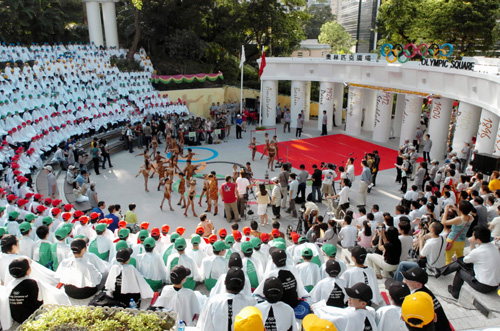 11日,香港舉行奧林匹克廣場揭幕禮。位于香港公園的廣場命名為奧林匹克廣場,是香港推廣奧運精神的地標,將來會有很多重要體育活動在此舉行。國際奧委會主席羅格在港協(xié)暨奧委會會長霍震霆的陪同下,為廣場啟用揭幕。(新華社圖)
