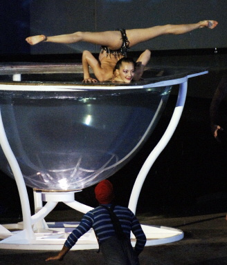 7月16日,2005世界游泳錦標賽在加拿大蒙特利爾開幕。圖為開幕儀式上一名游泳者在圓柱形的容器上表演。