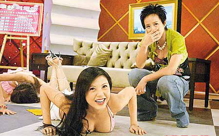 女F4隊長Fanny(中)做掌上壓時受F cup上圍所累,顯得上氣不接下氣,隊友(后)更做到趴地,令主持李明依(右)笑不攏嘴。