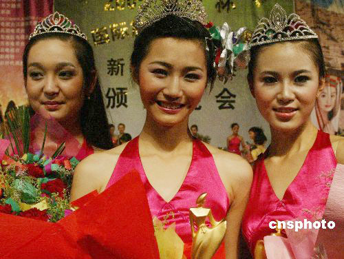 七月三十一日晚,“龜茲杯”2006國際旅游小姐新疆區總決賽在南疆阿克蘇市舉行,四十名入圍佳麗在決賽上展示泳裝、民族服飾以及晚裝,經角逐來自烏魯木齊市的選手付苓獲得大賽冠軍(中)、梁爽獲得亞軍(右)、維吾爾族選手妮魯拜爾獲得季軍。作者:錢興強