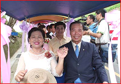 中新網(wǎng)8月1日電 據(jù)《中央日?qǐng)?bào)》報(bào)道,“2005臺(tái)中縣兩馬觀光季”“喜事連連愛相隨幸福久久集體婚禮”昨天(31日)在臺(tái)中縣后豐鐵馬道9號(hào)隧道口的夫妻樹廣場(chǎng)舉行,臺(tái)中縣長(zhǎng)黃仲生夫婦與縣“議會(huì)”副議長(zhǎng)陳芳隆共同為24對(duì)新人福證,隨后新人們搭乘電動(dòng)小火車暢游9號(hào)隧道及花梁鋼橋,與歷史共同做見證。