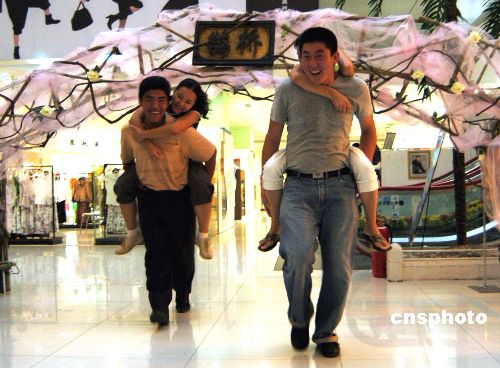 8月11日是“七七情人節”,在山東濰坊世紀泰華購物廣場,兩對情侶正在參加背妻比賽。近幾年來,“七七情人節”受到了越來越多的年輕人的喜愛。許多商家也抓住這一商機,舉辦活動吸引人氣,進行促銷。作者:王志德