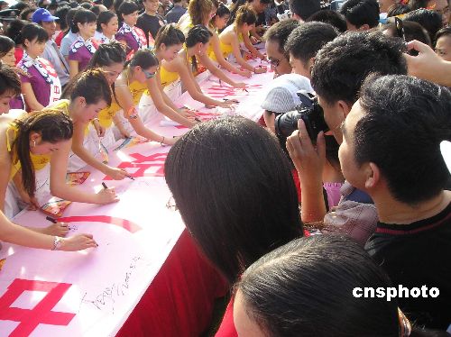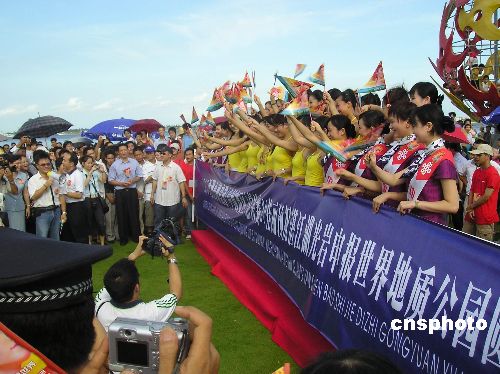 8月14日,2005年亞洲小姐(中國賽區(qū))進入總決賽的20名候選佳麗來到廣東湛江,傾情支持該市湖光巖申報世界地質(zhì)公園。作者:馬燦