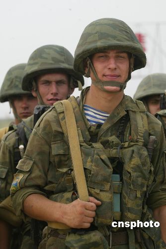 8月20日,中俄聯合軍事演習第二階段在中國青島開始,第二階段主要演練投送與展開、調整決心和組織協同,中俄雙方參演兵力近萬人。圖為參加中俄聯合軍事演習的俄羅斯空降兵在演練場上集結的情景。作者:王麗南