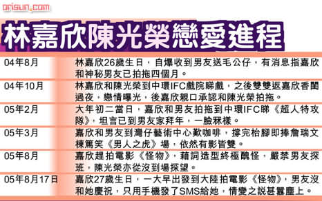 嘉欣和陳光榮自去年四月開始拍拖,陳光榮是鄭伊健御用唱片監(jiān)制,嘉欣經(jīng)伊健介紹認(rèn)識陳光榮,最初兩人只是好朋友,后來陳光榮和妻子婚姻出現(xiàn)問題,嘉欣常陪在身邊為他分憂,結(jié)果在陳光榮和妻子離婚后,兩人擦出愛火熱戀,去年十月兩人拍拖到看戲,陳光榮當(dāng)晚更到嘉欣香閨過夜,被傳媒踢爆戀情。