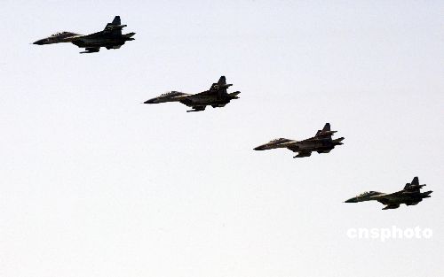 中俄聯(lián)合軍事演習(xí)海上封鎖演練中,蘇-27飛機(jī)以編隊(duì)形式飛過戰(zhàn)區(qū),與艦艇協(xié)同作戰(zhàn)。作者:王麗南