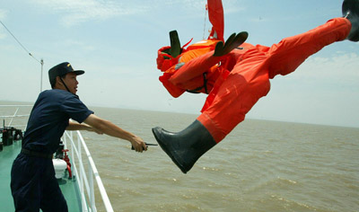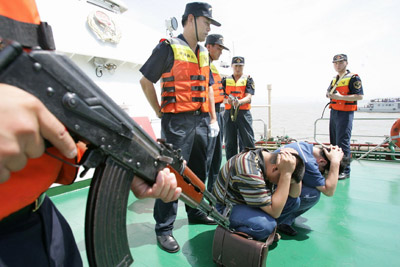 在這次演習中,靠幫和跳幫是緝私隊員著重鍛煉的兩個技術動作。“涉嫌走私船是不會乖乖聽話讓我們靠上去的。”杭州海關緝私局海查科長楊政說。今年1月,舟山緝私分局的一艘緝私艇在追擊一艘涉嫌走私冰凍白魚的漁船時,漁船邊逃邊擺尾,緝私艇根本無法靠船跳幫。追擊了一天一夜后,在溫州緝私分局一艘緝私艇的夾擊下才終于靠近漁船,緝私隊員在兩船起伏落差較大情況下跳幫過去,控制住了走私漁船。