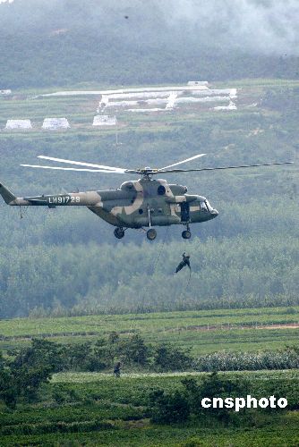 八月二十四日,“和平使命—2005”中俄聯(lián)合軍事演習(xí)第三階段兩棲登陸作戰(zhàn)實(shí)兵演練在山東半島展開(kāi)。圖為中國(guó)特戰(zhàn)隊(duì)員實(shí)施繩降。作者:王麗南
