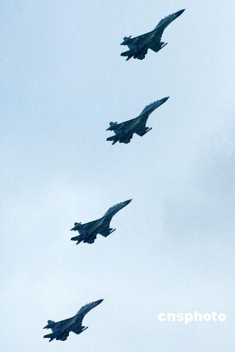 八月二十四日,“和平使命—2005”中俄聯(lián)合軍事演習(xí)第三階段兩棲登陸作戰(zhàn)實(shí)兵演練在山東半島展開。圖為參加兩棲登陸作戰(zhàn)實(shí)兵演練的中國(guó)空軍殲擊機(jī)四機(jī)編隊(duì)飛臨演習(xí)地域上空。作者:王麗南