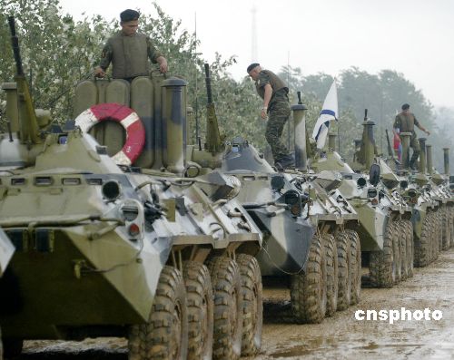 八月二十四日,“和平使命—2005”中俄聯合軍事演習兩棲登陸作戰實兵演練在山東半島如期進行。圖為完成登陸任務后的俄羅斯陸戰隊員,盡管全身濕透,仍很仔細地檢查車輛性能情況。作者:王麗南