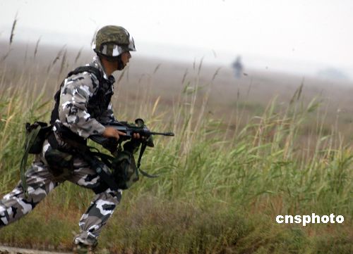 “和平使命-2005”中俄聯合軍事演習最后一個實兵行動課目——強制隔離作戰演練,25日上午在濟南軍區濰北靶場舉行。中國空降兵降落地面后奔向目標。作者:王麗南