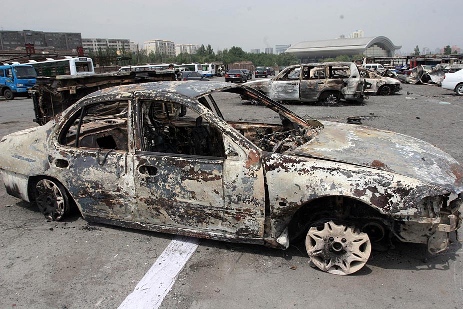 7月6日,烏魯木齊街頭被犯罪分子焚毀的汽車慘不忍睹。在5日晚發(fā)生的嚴(yán)重暴力犯罪事件中,已造成140人死亡,800多人受傷;被毀車輛達(dá)260部;受損門面房203間,民房14間,總過火面積達(dá)到56850平方米,全市共有220多處縱火點(diǎn),有兩棟樓房被燒毀。中新社發(fā) 夏春平 攝
